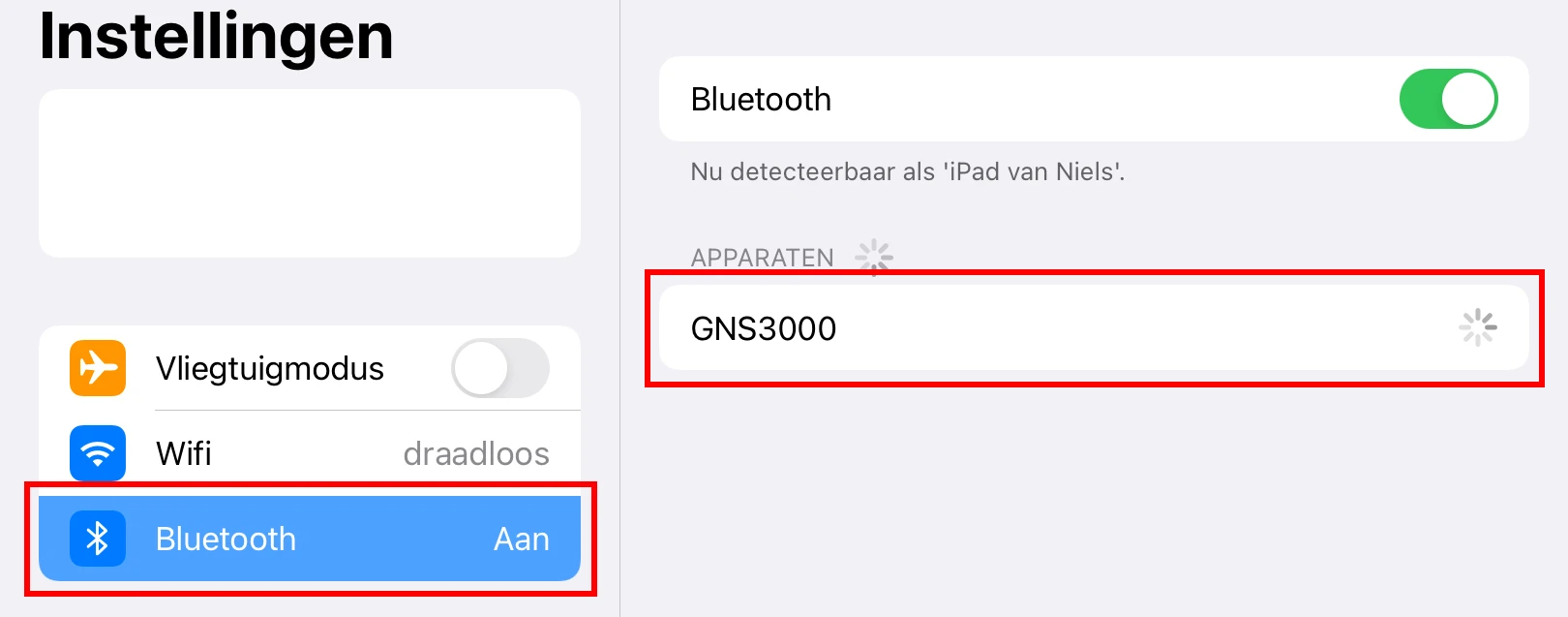 Op uw tablet, gaat u naar de instellingen van uw toestel, kies de optie 'Bluetooth' en kies 'GNS3000' onder Apparaten. Na enkele seconden krijgt u een melding dat het toestel gekoppeld is.